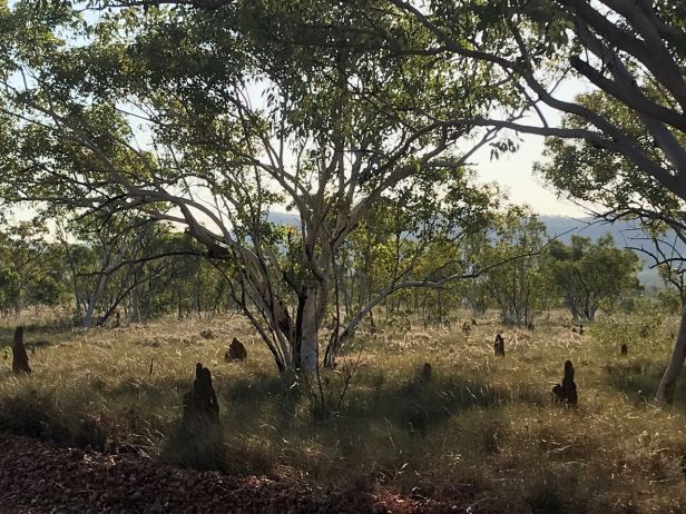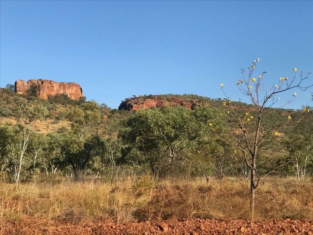 After a night at Banka Banka on the Stuart Highway – a comfy roadside caravan camping setup that also catered to workers on a nearby gas project, we turned off soon after onto the dirt, on the Buchanan Highway. The road surface wasn’t too bad and we only passed two road trains in the 300km or so of travel. For the first, following earlier advice, we pulled over and the wind direction left us shrouded in a huge dust cloud and we were unable to see for quite a time (felt like a few minutes) after the trailers had passed. The second time the wind was to the side and much less blinding. No wonder you come to a halt when they pass on a dirt road and give them the full width of the road, notwithstanding all the potential for windscreen damage.